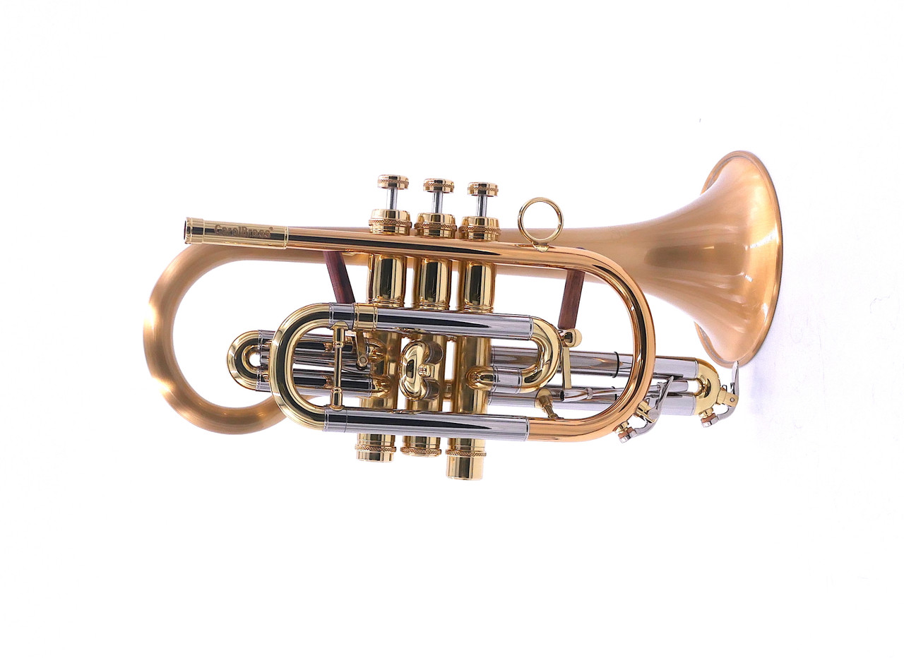 This awesome professional model cornet boasts a 0.465 bore, gold brass & wire rim soldered bell, unique trigger system, and a gold brass leadpipe.